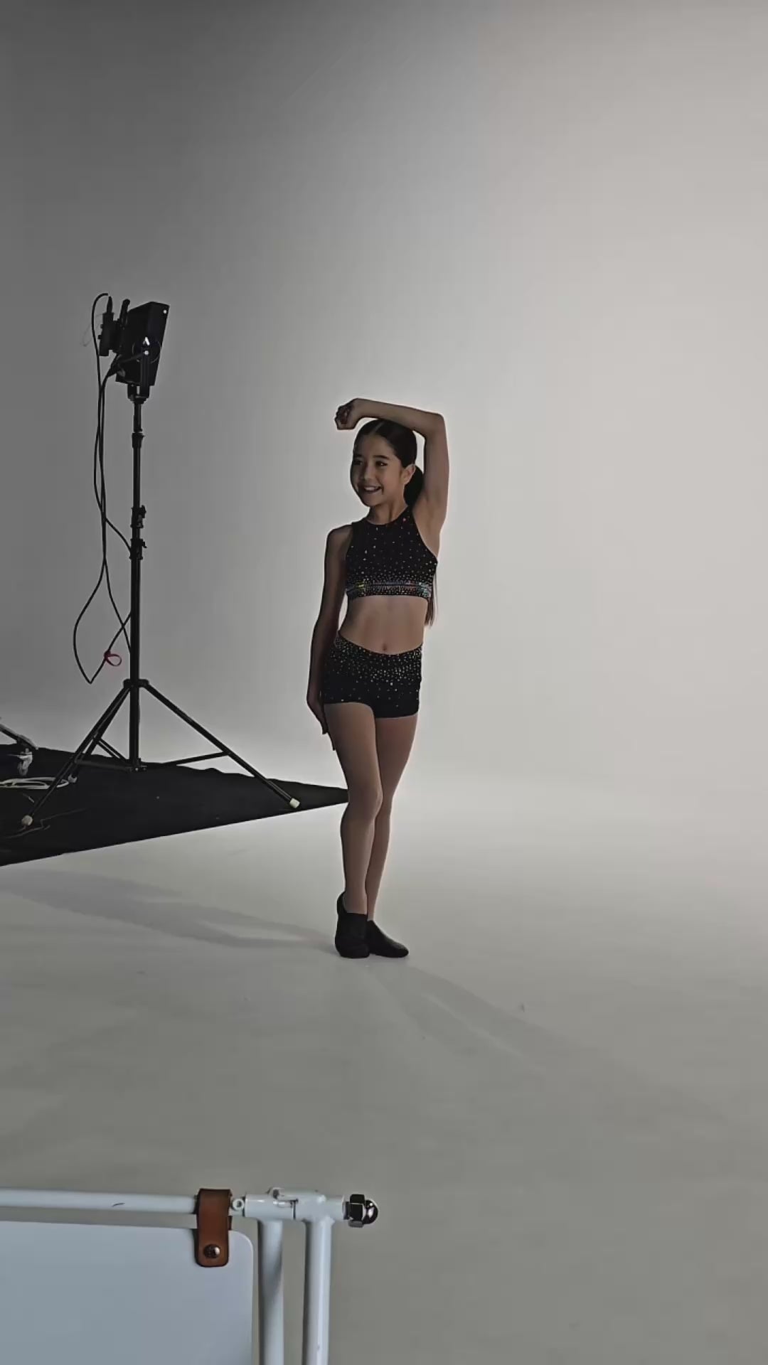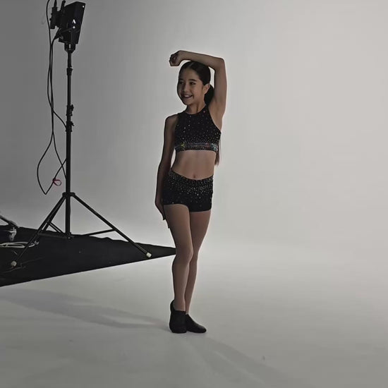 This stunning black crop is made from a super-soft, light weight stretchy fabric. The sparkling crystals shimmer under the lights making it the ultimate outfit for little athletes who love to feel confident, comfy, and stylish.